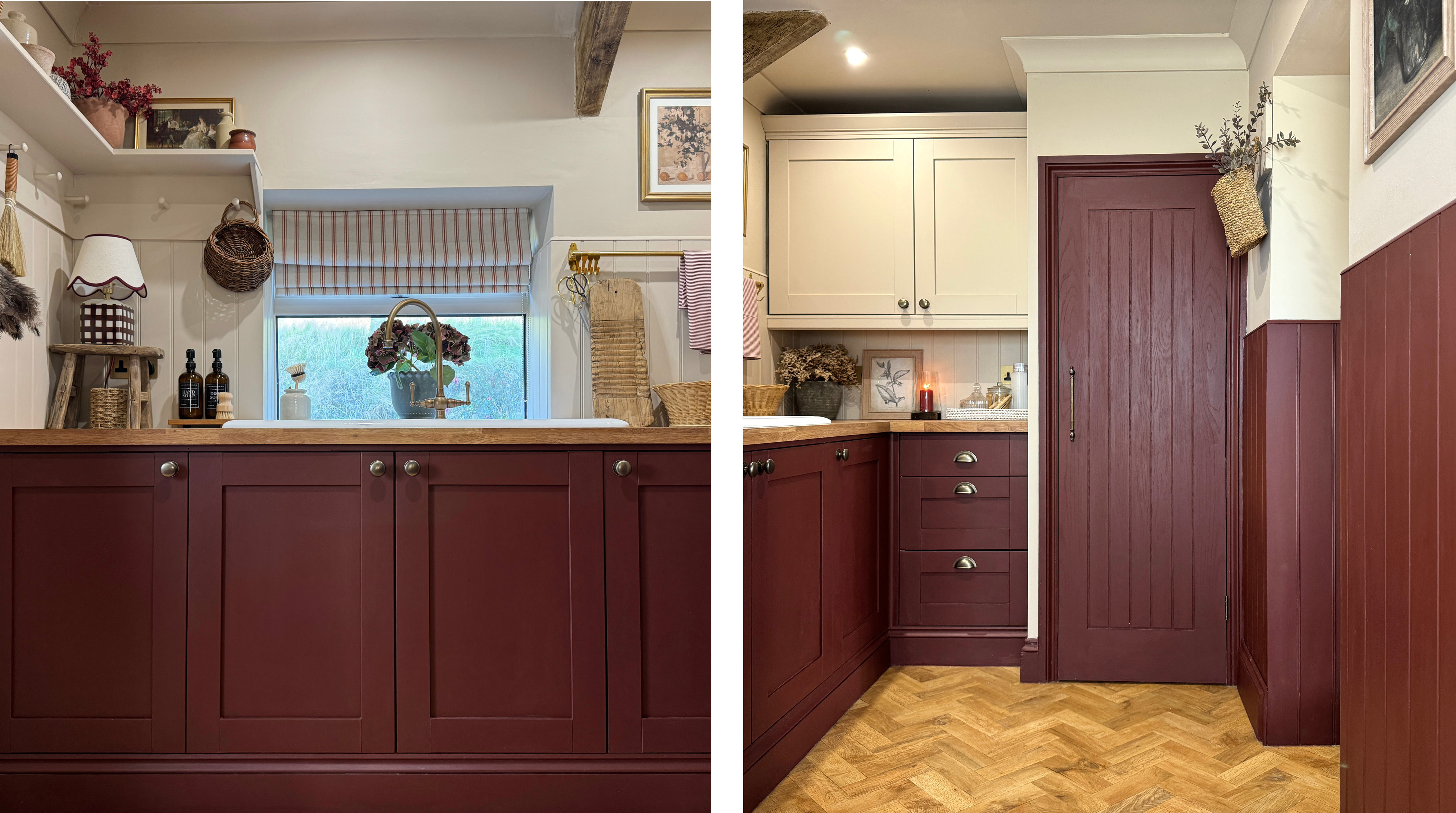 Left and right: Valentina kitchen cabinets and woodwork by @cottagerenovationcwmrhys