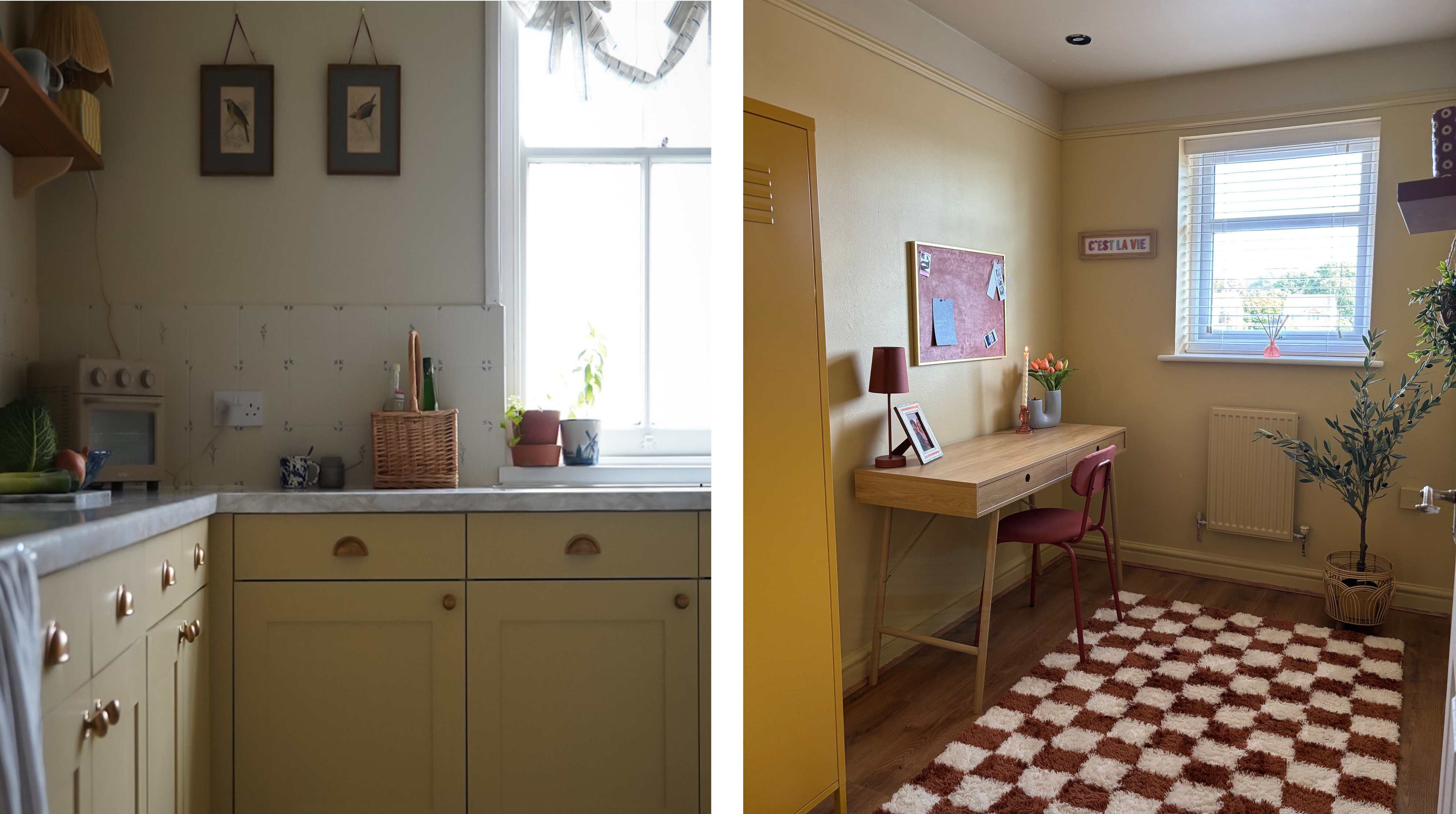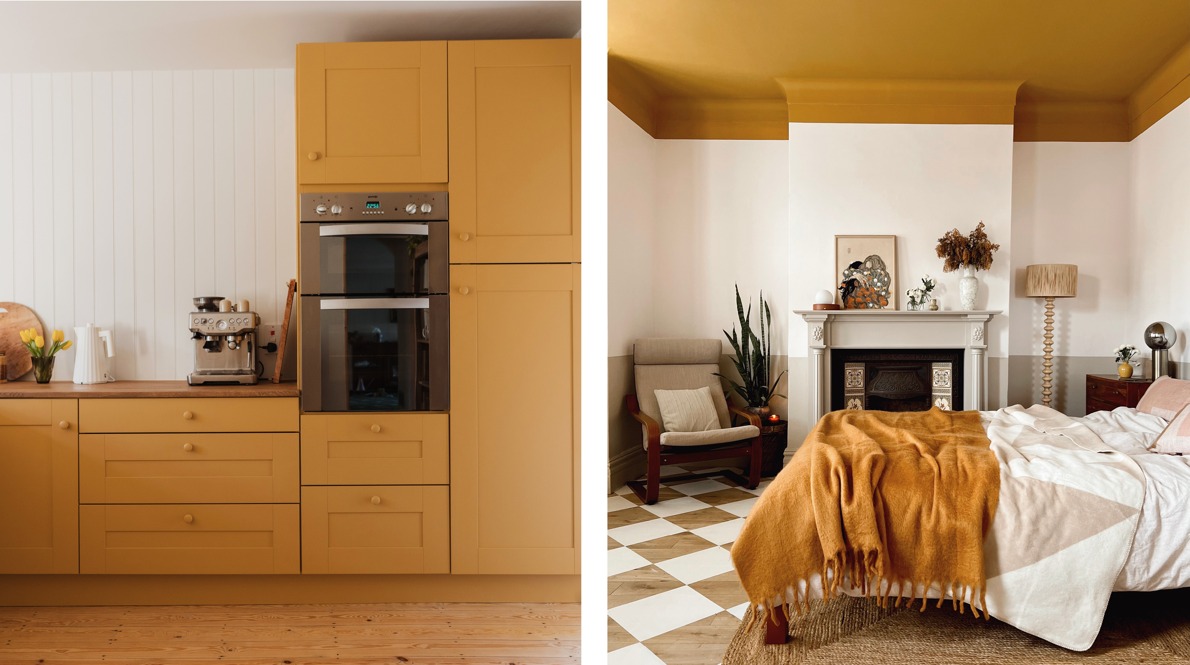 Use our Kitchen Cupboard Paint to transform drawers and cabinets with Dijon, contrasting the rich, grounding yellow with delicate off-white Steamed Milk. This will instantly create an aura of calm. For a light, yet saturated palette, a muted earthy yellow like Dijon will pair beautifully with soft, pink-toned neutral Sweet Nothing. This colour combo creates harmony, without the intensity of true complementary colours like yellow and purple.