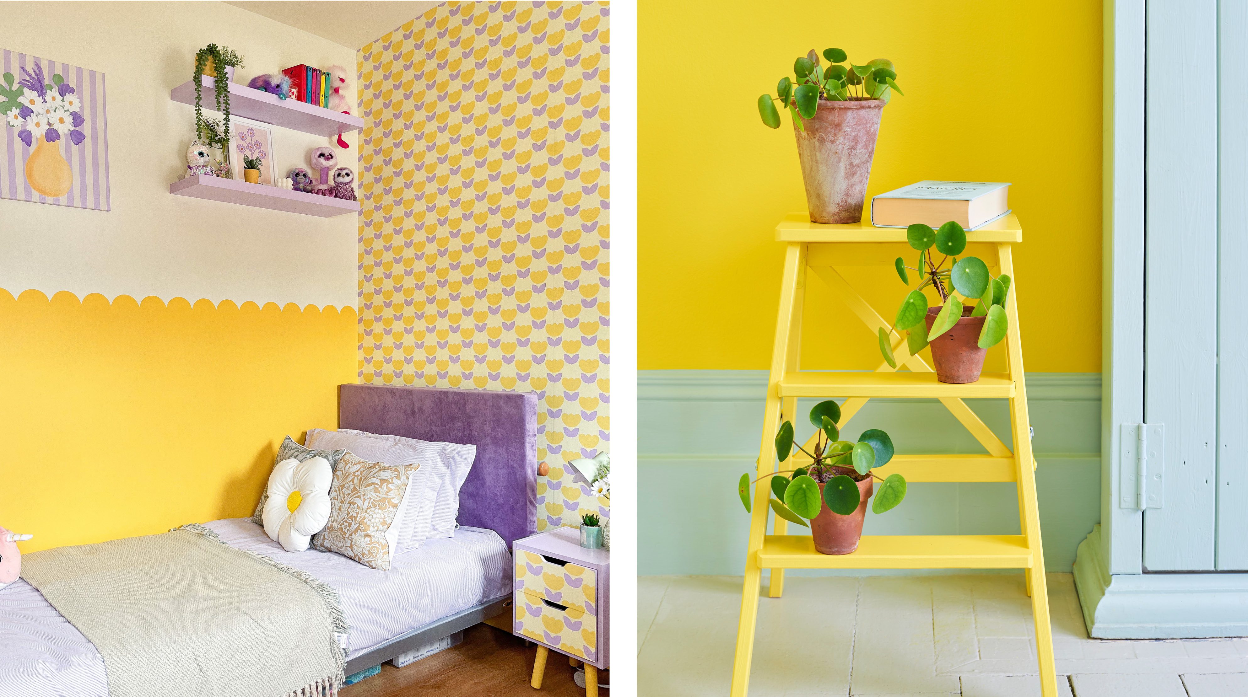 A bright, sunshine yellow is the perfect way to liven up rooms with positive energy. Our vibrant yellow Lemon Jelly has warm undertones, perfect for heating up even the coolest rooms. Soften the intensity of Lemon Jelly with our bright, yellow-toned cream Shortbread. For a visually pleasing contrast, use our Furniture Paint to decorate side tables, drawers, shelving and more with a complementary accent colour. Our bright lilac Violet Macaroon pairs beautifully with yellow as they are on opposite ends of the colour wheel, creating a dynamic contrast of warm and cool.