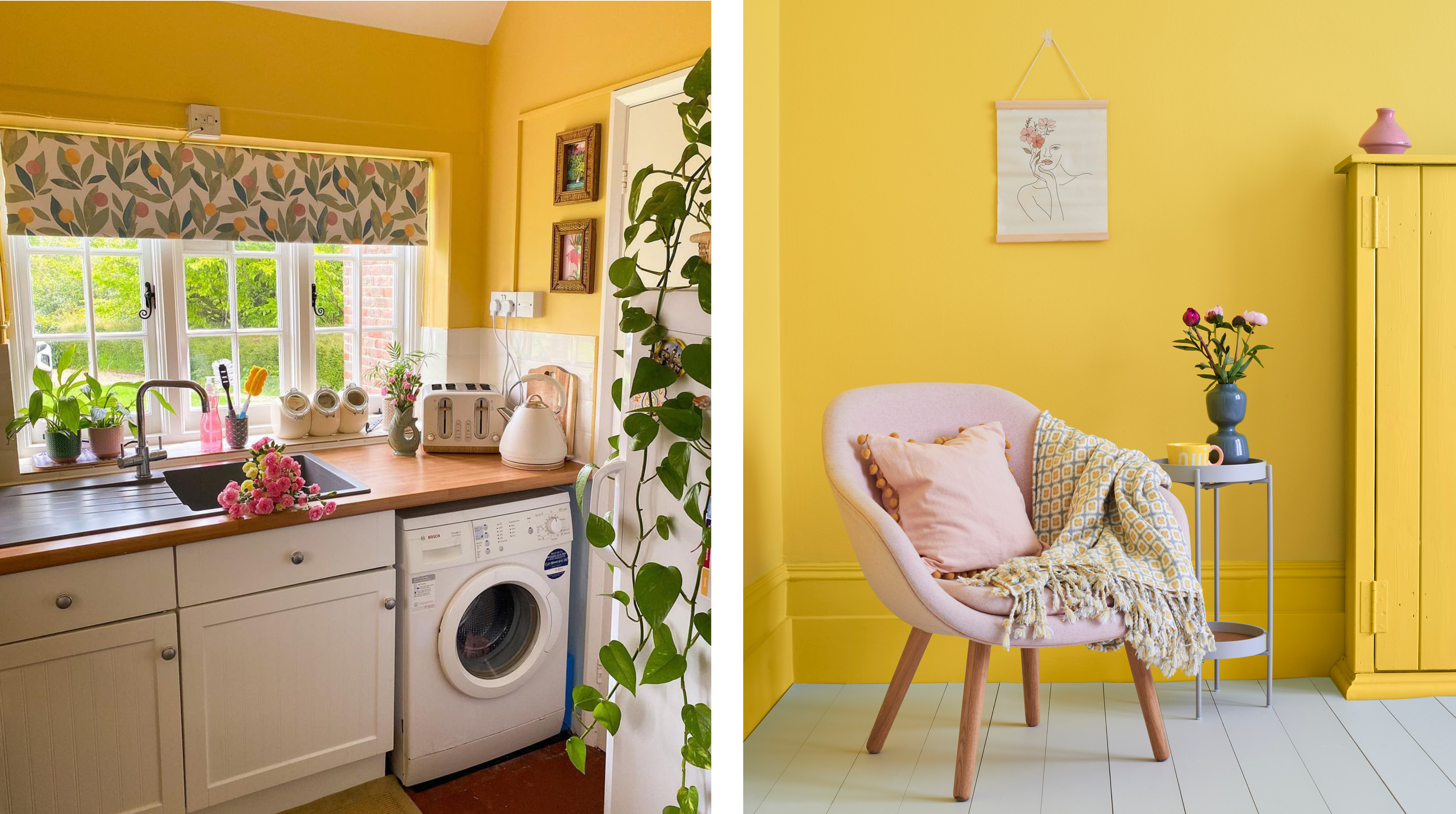 For a pop of energy, try Sandstorm Kitchen Cupboard Paint on the cabinets to create a striking yellow accent. Paint the kitchen wall and tiles in Longsands, for a neutral backdrop that allows the yellow to take centre stage. Layer multiple shades of yellow on walls, ceilings and furniture to create a sense of depth. Pair honeyed yellows with rich, clay red for a warm, earthy feel.